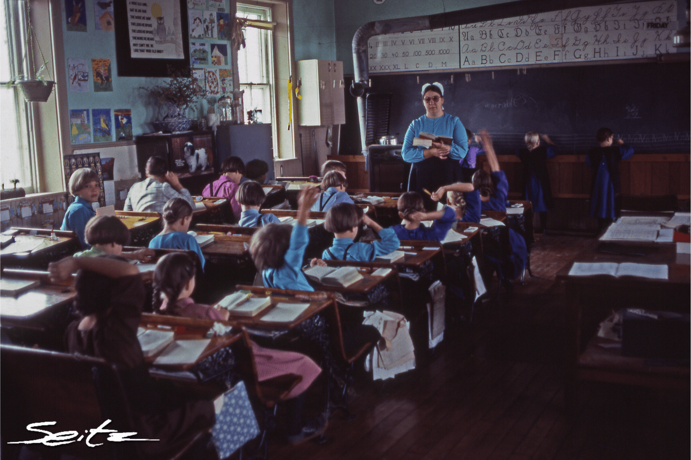 Inside the classroom, she asked if I would tell the students what I do. A little startled, I said that I take pictures so that others can see how beautiful the world is, and that the photos I take often get printed in books for schools. The Amish students seemed satisfied. Before leaving, I stood at the back of the classroom, leaning against the doorframe to steady myself in the dimly-lighted room, and exposed a couple of frames that have been published many times in the U.S. and abroad.